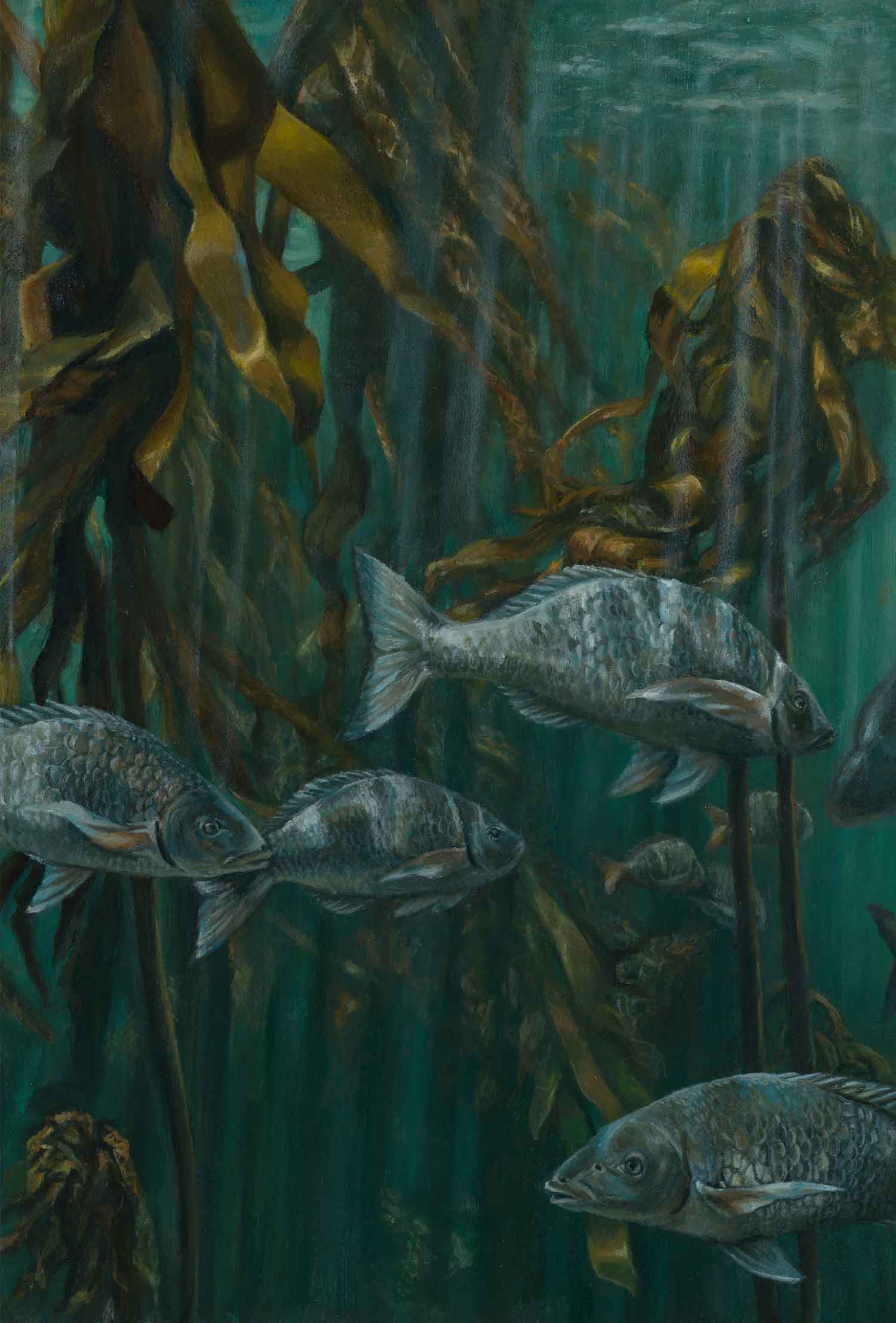 An ode to the gentle rhythm of slow tides as they filter rays of sunshine drifting down through ocean hues and between the kelp forests.